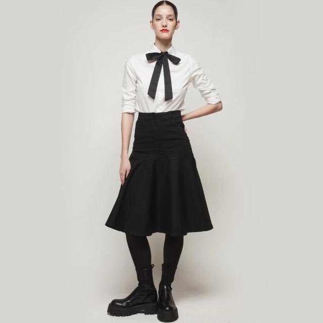 FALDA CINCO BOLSILLOS EN DENIM BLACK ELASTIZADO CON CORTE EN LA CADERA Y GRAN VUELO CAMPANA PLATO