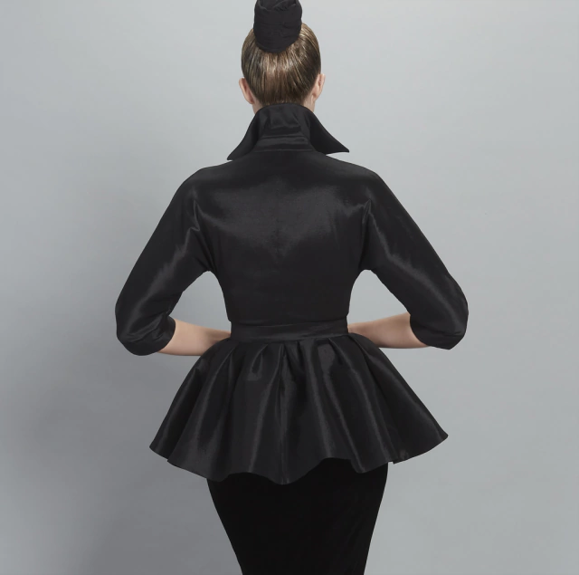 BLUSA EN TAFTÁN CON CIERRE INVISIBLE DELANTERO. CORTE A LA CINTURA Y TERMINACIONES A MANO.