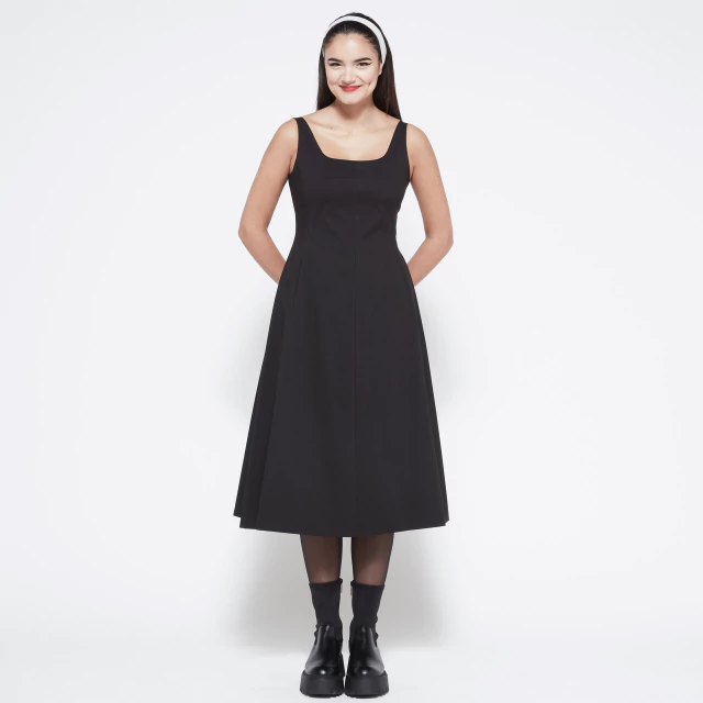 VESTIDO ELASTIZADO DE ESCOTE CUADRADO, BOLSILLOS Y FALDA DE LINEA EVASÉ.