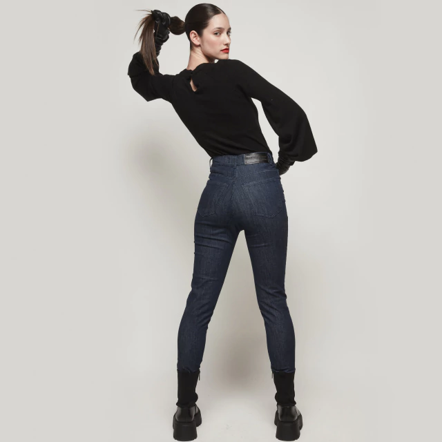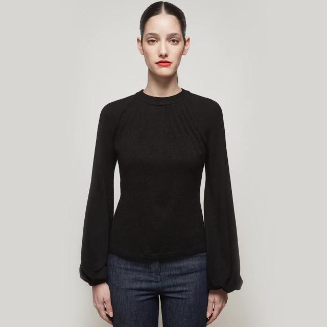 BLUSA EN ANGORINA CON CUELLO A LA BASE, FRENTE DRAPEADO Y MANGAS LARGAS ABULLONADAS.