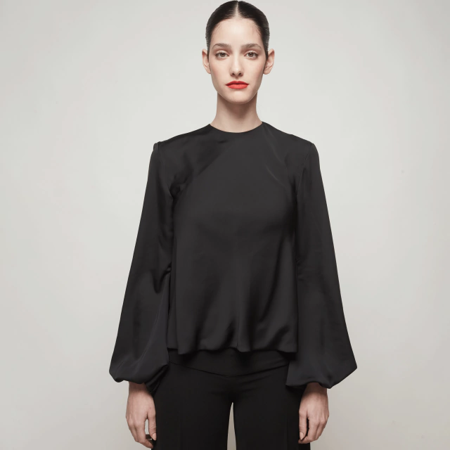 BLUSA EN SATÉN VISCOSA DOBLE CON CUELLO A LA BASE Y MANGAS LARGAS ABULLONADAS.
